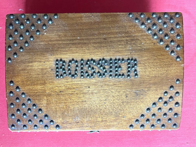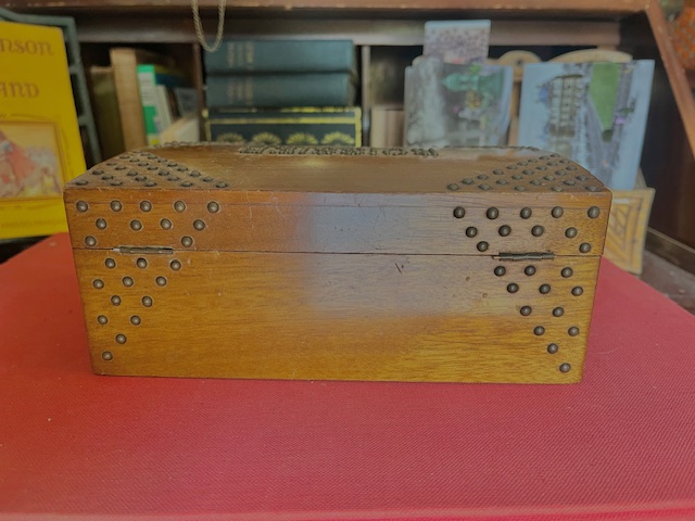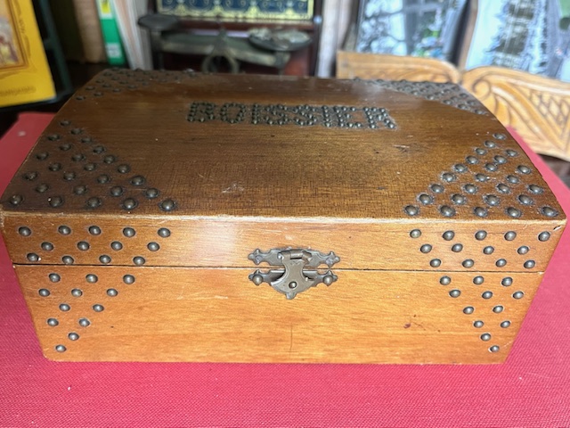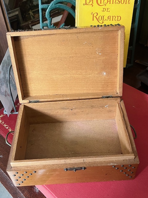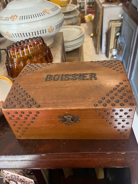 Joli coffret en bois clouté.Ancienne boite à confIserie de la marque Boissier.