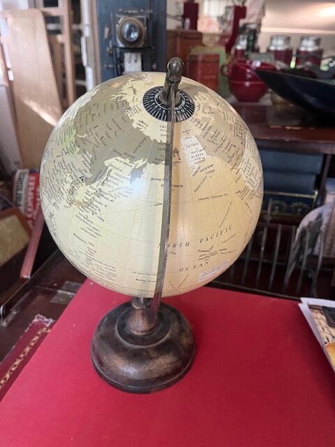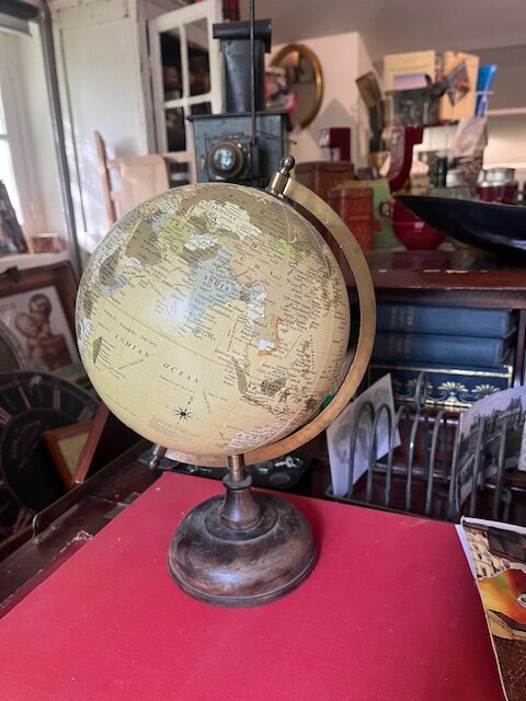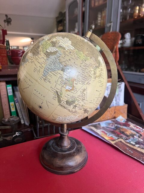 Globe mappemonde tournant avec pied en bois et support en métal.