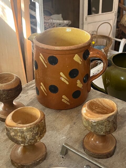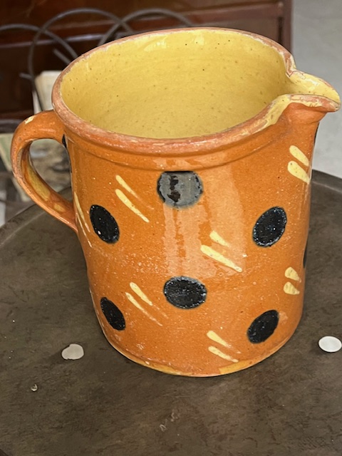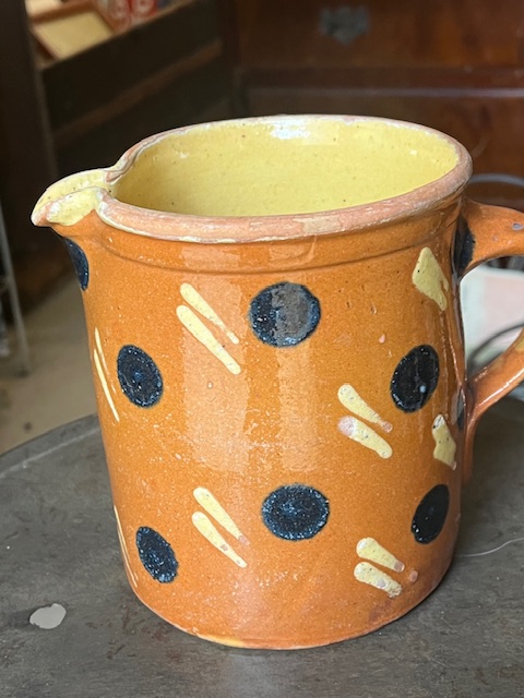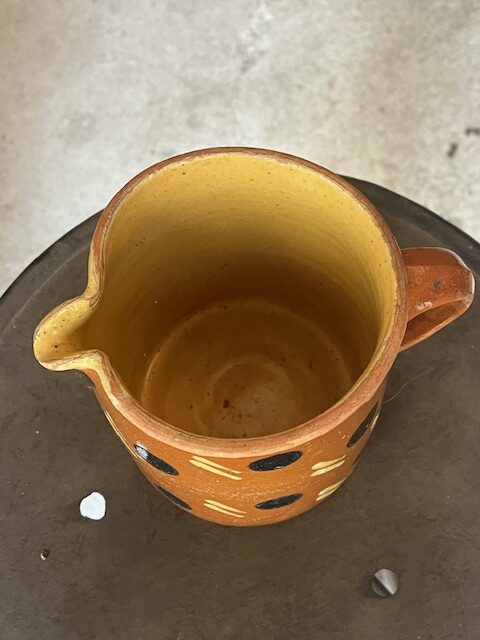 Petit pichet à pois en grès. Fond brun, motifs noirs et jaunes, intérieur jaune.