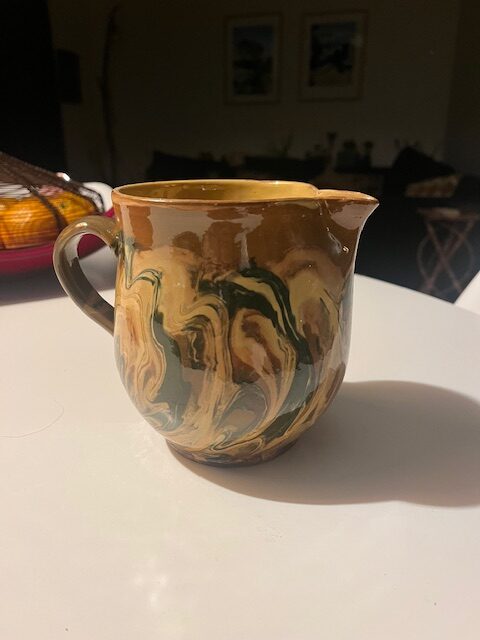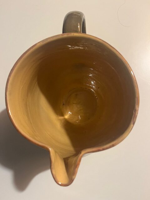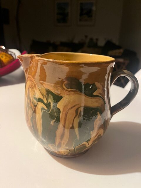 Petit pichet aux tonalités tout à fait automnales – jaune, brun et vert, en grès.  Intérieur jaune et impeccable.