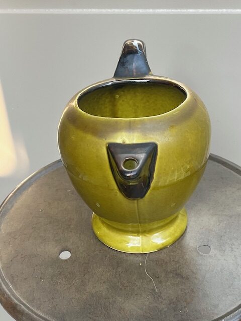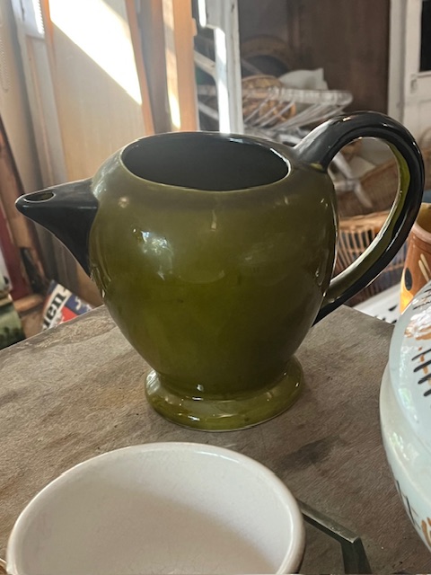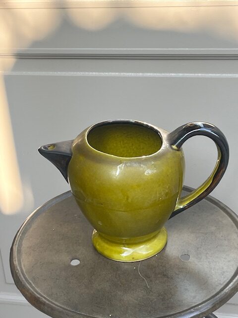 Petit pichet à pois en grès. Fond brun, motifs noirs et jaunes, intérieur jaune.