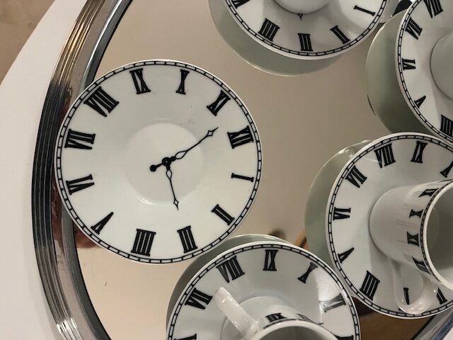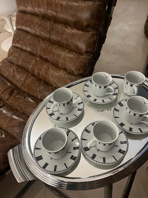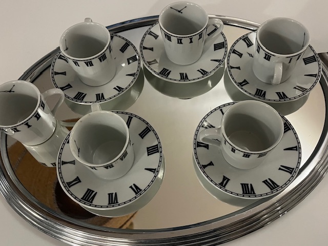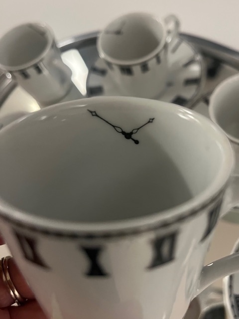 Service à café blanc et noir aux motifs d’un réveil et de ses aiguilles.